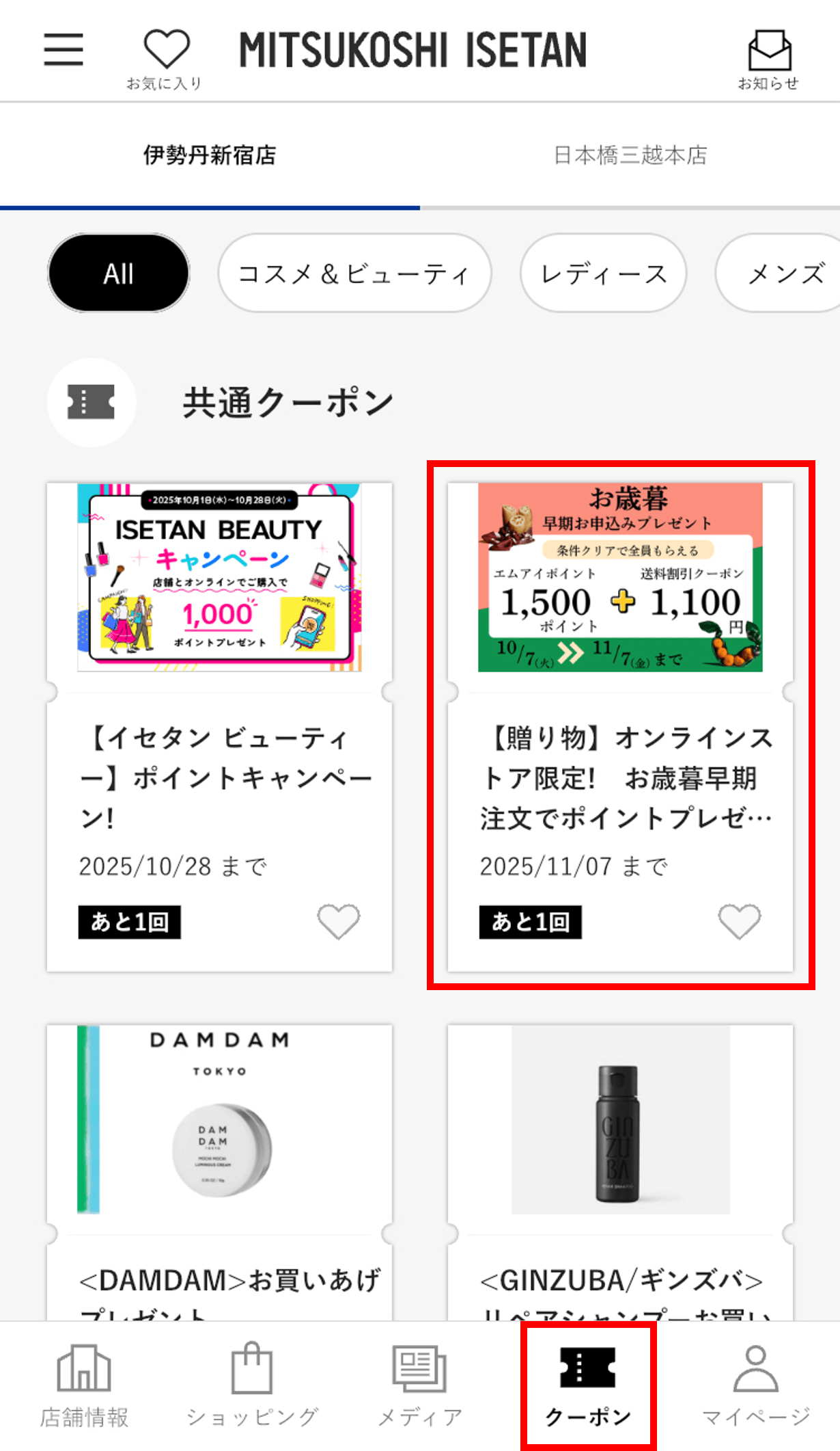 画面下部「クーポン」をタップし、表示されたクーポンの中から、下記タイトルの対象クーポンを探してタップしてください。